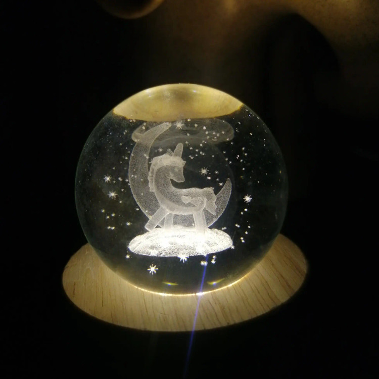 گوی کریستالی چراغدار طرح ماه و اسب تک شاخ ارتفاع کار 6 cm میباشد جنس گوی کریستال و جنس پایه چوبی