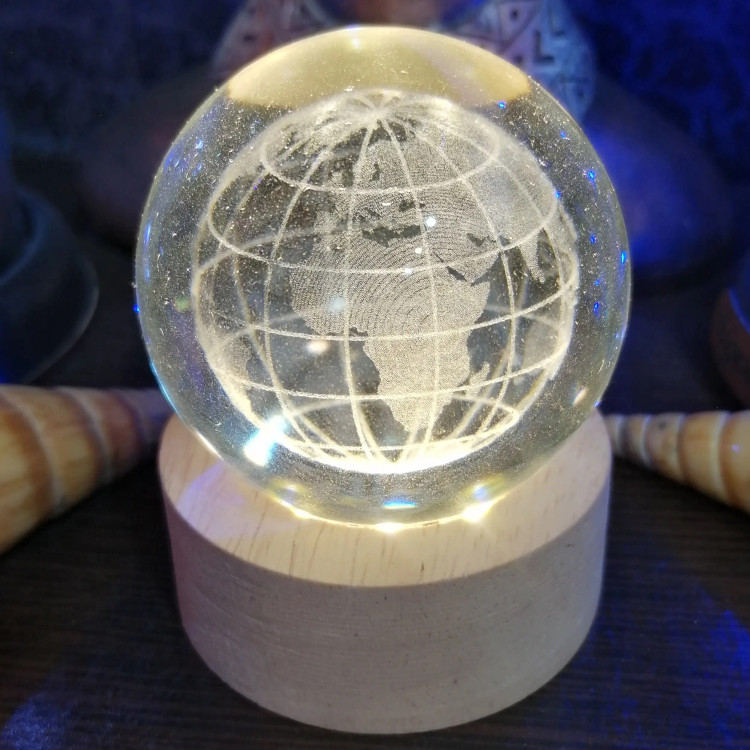 گوی کریستال چراغدار طرح کره زمین وارداتي جنس درجه 1 روشنایی از طریق کابل برق usb ارتفاع کار ۸ cm میباشد قطر گوی ۶